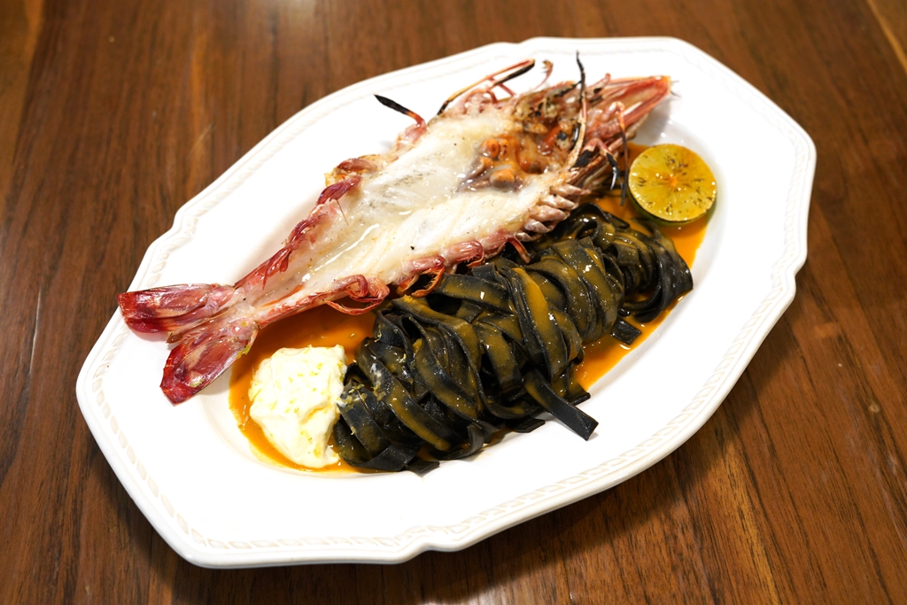 6. Grilled Giant Tiger Prawn, Squid Ink Fettuccine & Garlic-Lime Emulsion (740++ THB) [16/20] – เฟตตูชินีเส้นหมึกดำเสิร์ฟคู่กับกุ้งลายเสือตัวใหญ่ย่างในซอสกระเทียมมะนาวและบิสก์กุ้งหอมๆ