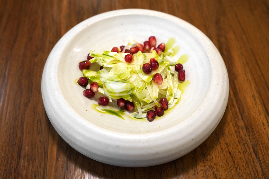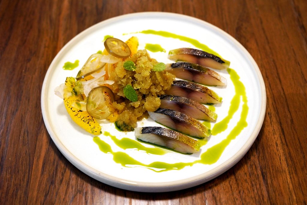 5. Mackerel Citrus Crudo, Mint Aguachile Granita & Pickled Jalapeno (450++ THB) [15/20] – เนื้อปลาแมคเคอเรลซาชิมิเสิร์ฟคู่กับส้มเบิร์นไฟ พริกฮาลาปิญโญ่ดองและกรานิต้าน้ำยำใบมิ้นต์
