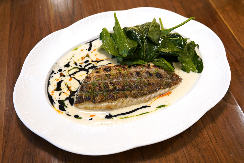 7. Binchotan-Grilled Dry-Aged Seabass, Confit Garlic & Miso Sauce (580++ THB) [15/20] – ปลากระพงดรายเอจย่างเตาถ่ายเสิร์ฟบนซอสมิโสะกระเทียมคู่กับสลัดเฟนเนลแอปเปิ้ลเขียวและผักโขม