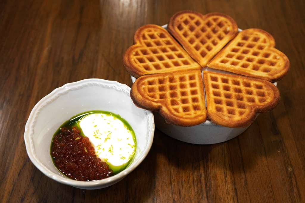 3. Brown Butter Nordic Waffle, Sour Cream & Aomori Ikura (420++ THB) [16/20] – วาฟเฟิลสไตล์นอร์ดิกรูปหัวใจเสิร์ฟคู่กับซาวครีมและไข่ปลาแซลมอน