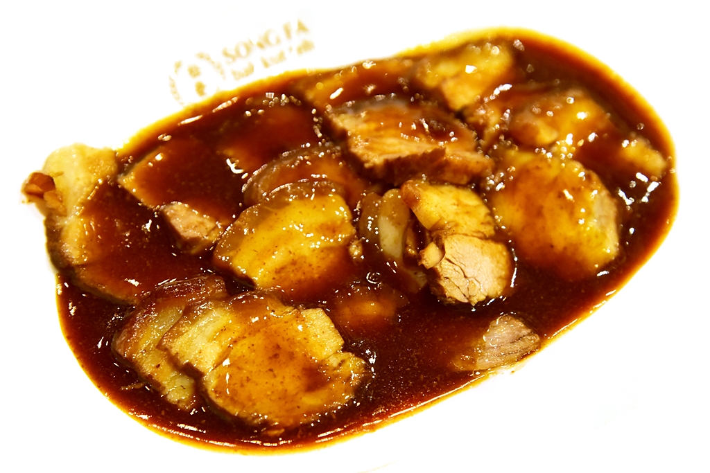 3. Braised Pork Belly (220 THB) – เนื้อหมูสามชั้นตุ๋นพะโล้รสชาติออกหวานมันนุ่มละลาย