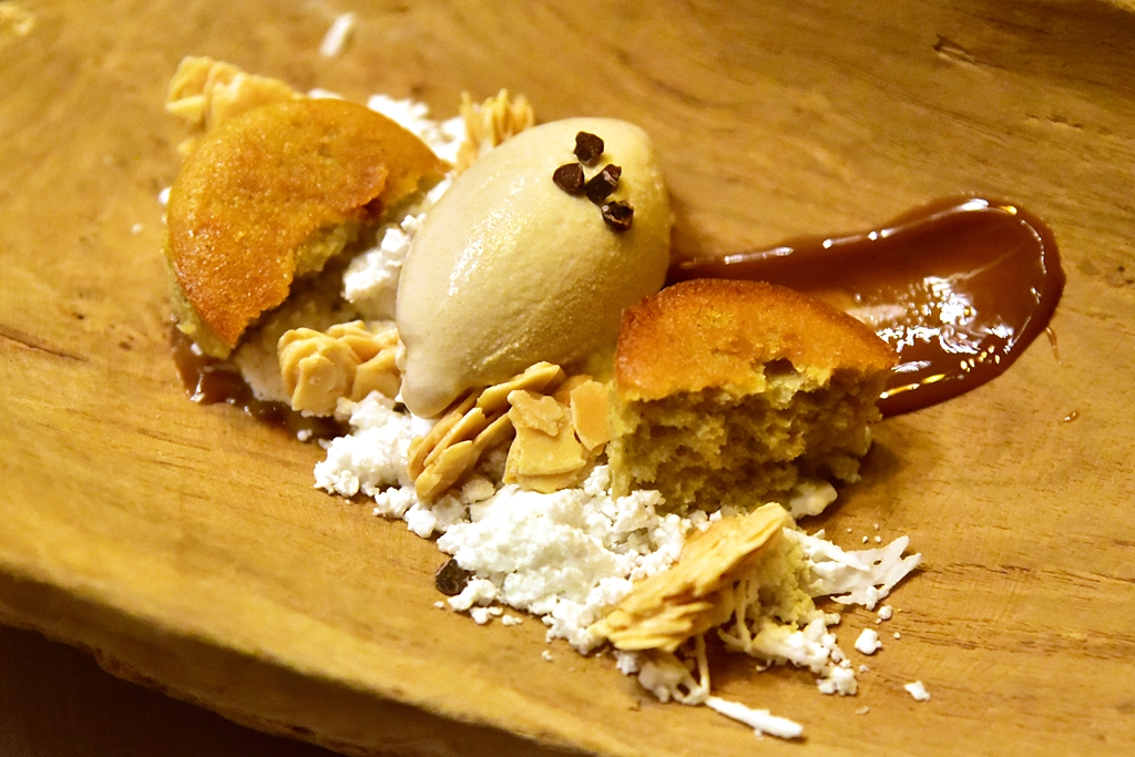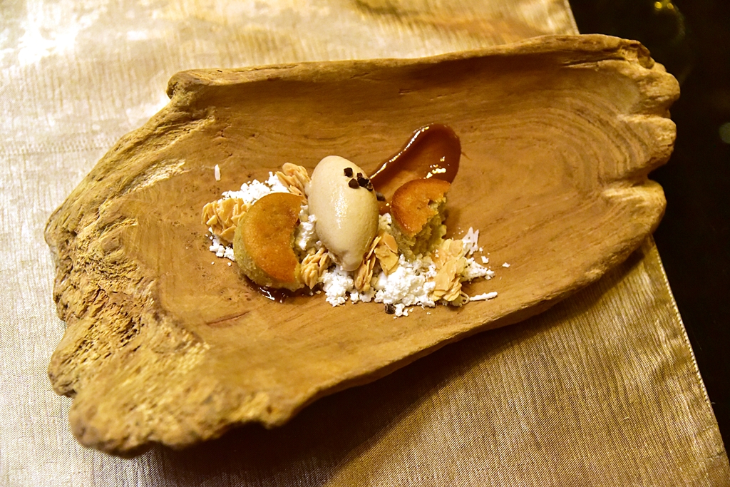 8th course: Banana Cake, Salted Ice Cream, Caramelised Milk [16/20] – เค้กกล้วยหอมเสิร์ฟคู่กับไอศกรีมรสเค็มมันควบคู่กับเกล็ดหิมะน้ำกะทิและอัลมอนด์แผ่น