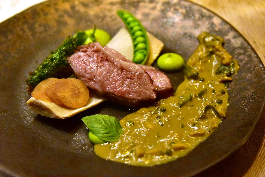 6th course: Slow-cooked Wagyu Beef with Homemade Oyster Sauce, Krachai [17/20] – เนื้อวากิวซูวีร์นาน 2 วันเสิร์ฟพร้อมด้วยซอสถั่วแระญี่ปุ่นและซอสหอยนางรมผสมกระชาย ตัวเนื้อนุ่มมาก ตัวซอสก็รสชาติดี ทานคู่กับข้าวหอมมะลินี่เยี่ยมเลย