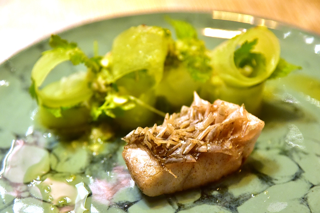 2nd course: Spicy Apple Cucumber Salad, Crispy Seabass [15/20] – ปลากระพงขาวหนังกรอบเกร็ดกรอบเสิร์ฟคู่กับยำแตงกวาญี่ปุ่นและแอปเปิ้ลเขียวที่มีรสชาติของส้มยูสุและเสาวรส