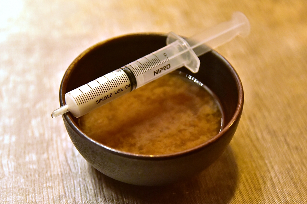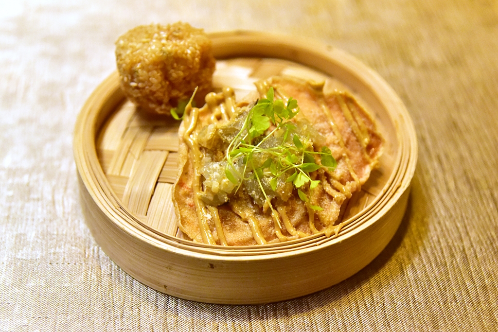 1st course: Tom Yum Prawns with DIY Noodles, Prawn Crackers, Prawn Bread [16/20] – “มาม่าต้มยำกุ้ง” ตามแบบฉบับของ Sra Bua by Kiin Kiin ที่เสิร์ฟซุปต้มยำรสชาติกลมกล่อมคู่กับเต้าหู้ในเข็มฉีดยาที่สามารถฉีดออกมาเป็นเส้นได้ พร้อมด้วยเครื่องเคียงอย่างขนมปังหน้ากุ้งและข้าวเกรียบกุ้ง ถือเป็นเมนูที่มีเสน่ห์และสนุกเวลาทานมาก