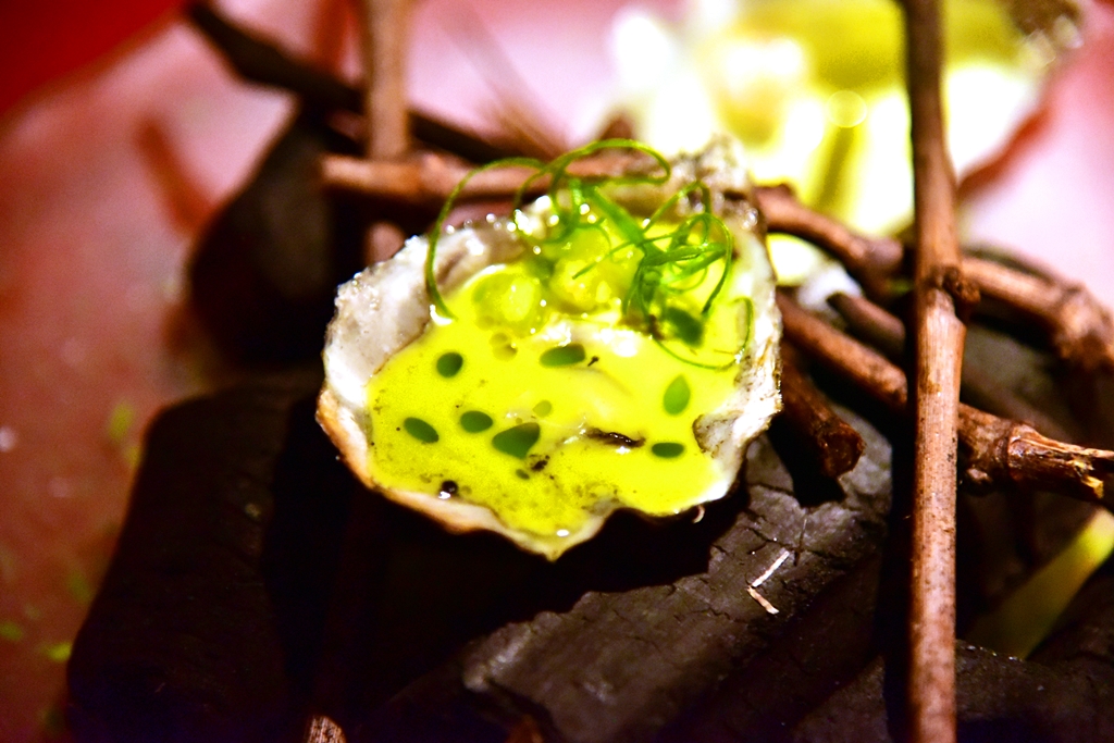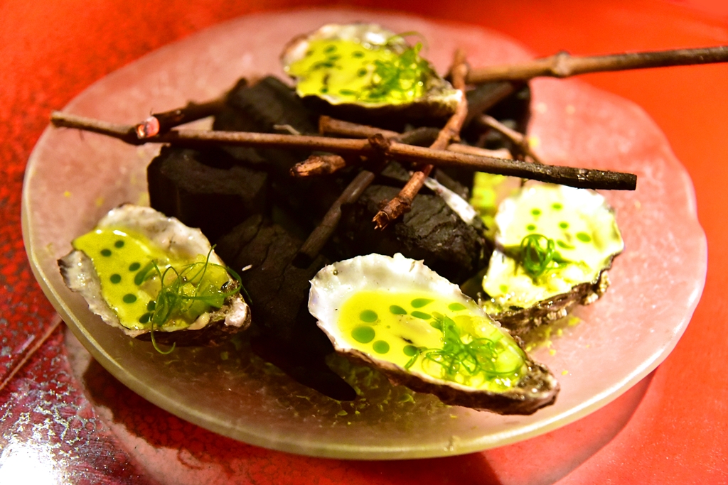 6. Irish Oysters on Holiday to Acapulo (20.00 GBP) – หอยนางรมย่างเสิร์ฟคู่กับซุปมะเขือเทศเขียวและพริกฮาลาปิญโญ่