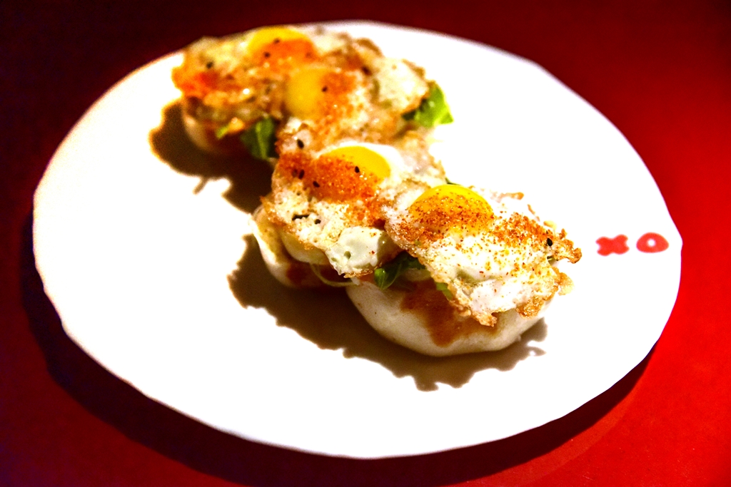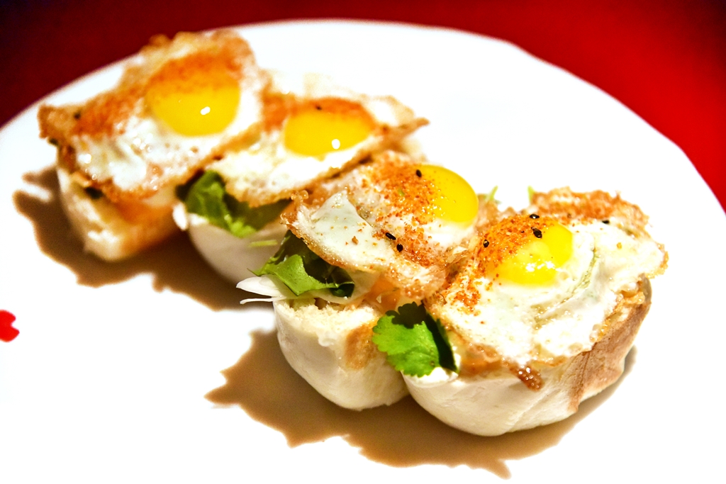 3. Steamed XO Club Sandwich (29.00 GBP) – คลับแซนด์วิชไข่นกกระทาเยิ้มๆด้านในประกอบด้วยเนื้อหมูหันสไตล์สเปน ชีสริคอตต้าและซอสมายองเนสพริก