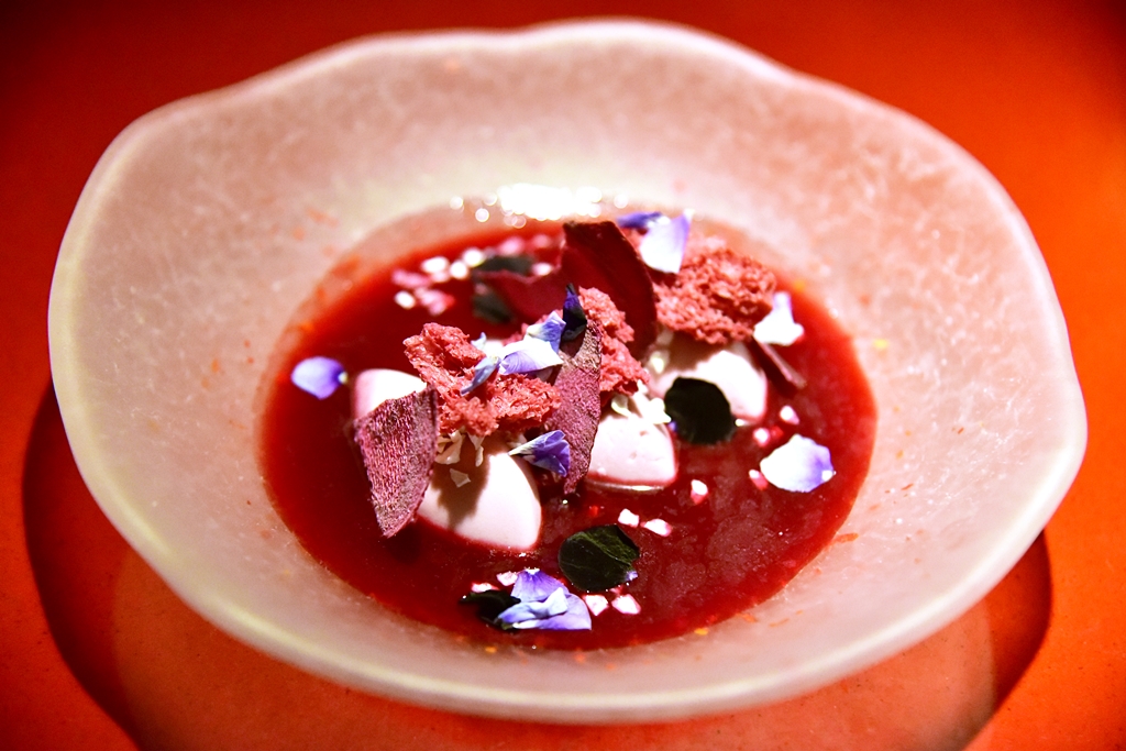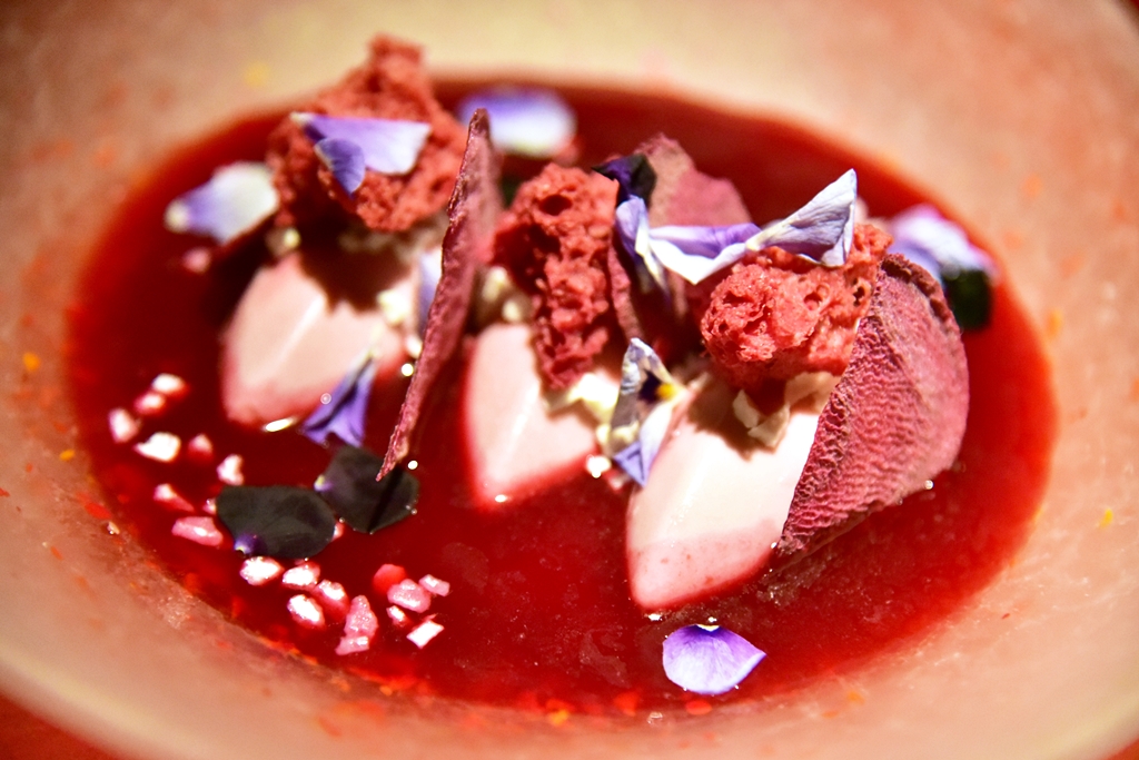 13. Violet Mousse (9.00 GBP) – มูสแบล็กเบอร์รีในซอสแตงโมพร้อมด้วยสปอนจ์เค้กบีทรูท