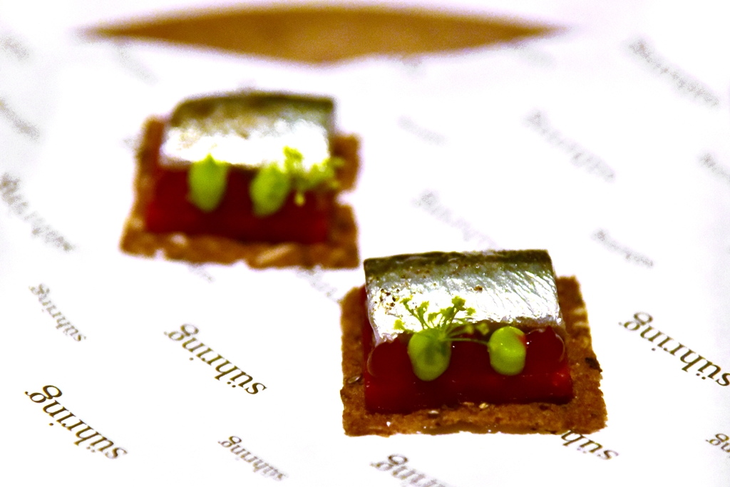 2nd course: Bismarkherring – ทาร์ตปลาแฮริ่งดองเสิร์ฟบนบีทรูทสีชมพูสด ทานคำเดียวหมด รสชาติเปรี้ยวหวานกรอบลงตัว