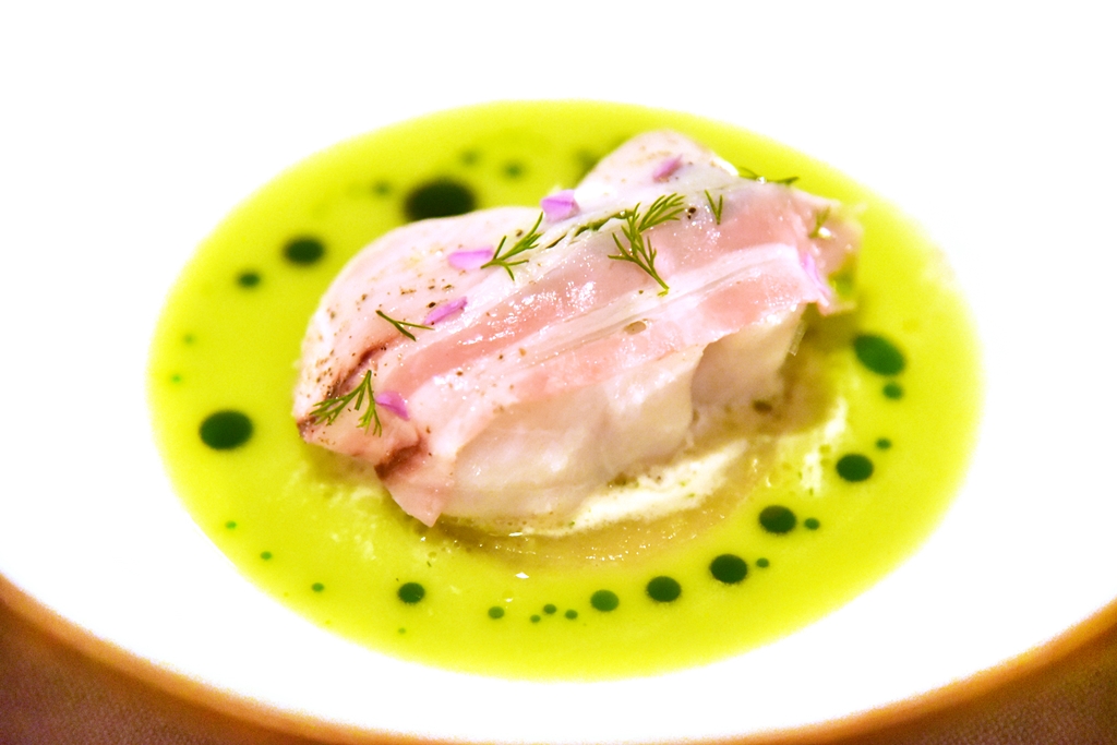 8th course: Cod & Braised Cucumber – เนื้อปลาค้อดโปะหน้าด้วยแฮมเสิร์ฟคู่กับแตงกวาหลากหลายสไตล์ เป็นเมนูที่อร่อยแบบเบาๆแต่ลึกซึ้ง !!