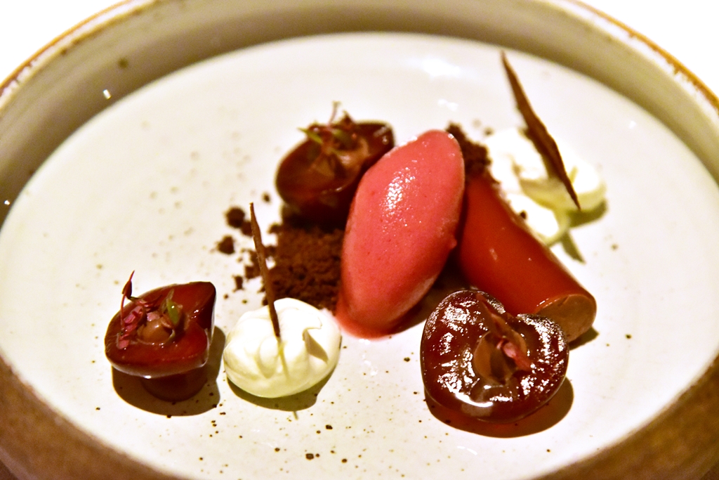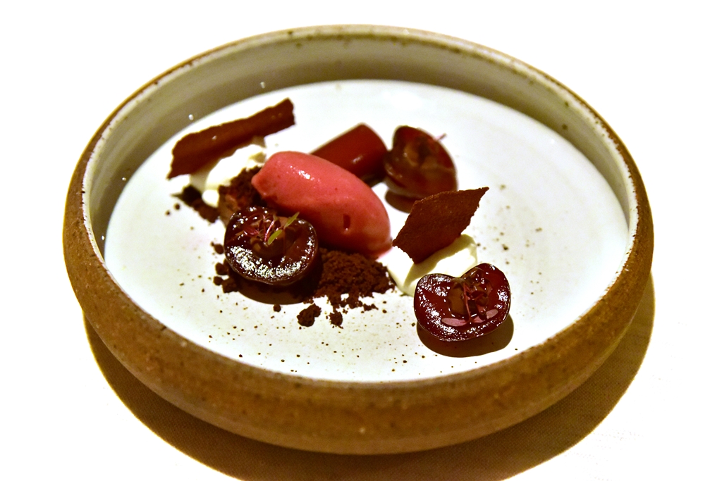 12th course: Schwarzwalder Kirschtorte – เค้กแบล็กฟอเรสต์แบบ deconstructed ที่ประกอบไปด้วยไอศกรีมเชอรี่รสเปรี้ยวจี๊ด เชอร์รีเชื่อม ช็อกโกแลตครัมเบิ้ล มูสช็อกโกแลตและครีมรสนุ่มละมุน