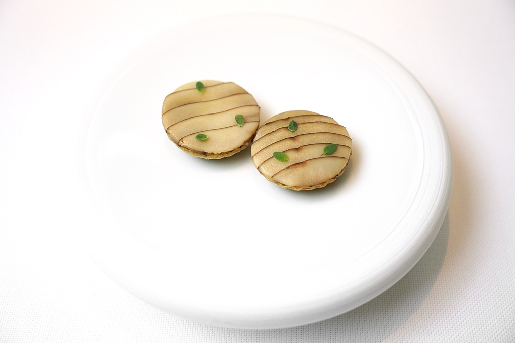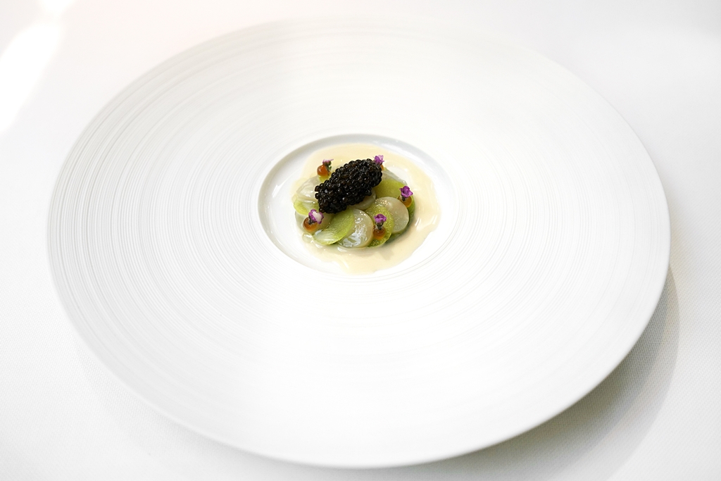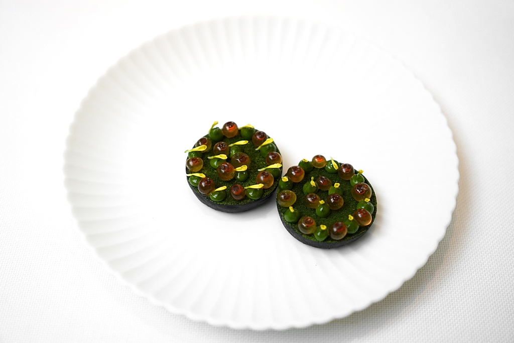 1st course : SCALLOP & KRISTAL CAVIAR / hazelnut / seaweed [17/20] – หอยเชลล์เนื้อหวานฉ่ำเสิร์ฟในซอสครีมนมฮาเซลนัทและสาหร่ายท็อปด้วยไข่ปลาคาเวียร์แบบจุใจ