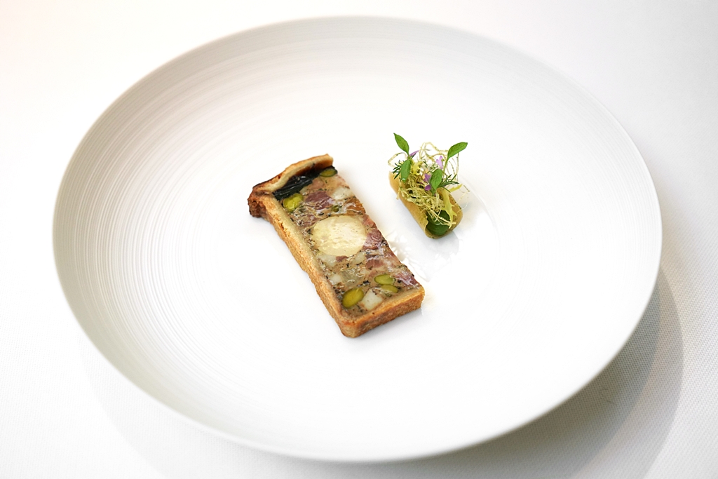 2nd course : WILDSCHEINPASTETE / wild boar pie / parsley root / pistachio [16/20] – พายเนื้อหมูป่าจาก Black Forest ที่ด้านในยังมีฟัวกราส์และเจลลี่ไวน์แดง เสิร์ฟแบบอุณหภูมิห้องคู่กับแป้งกรอบไส้ซอสครีมพาร์สลีย์