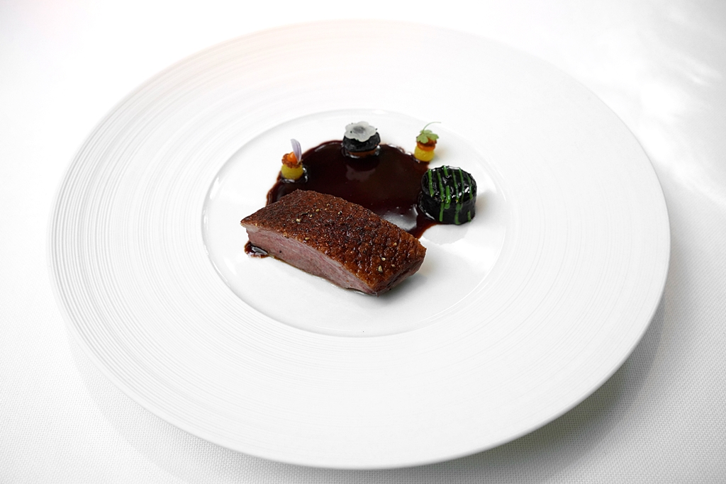5th course : DUCK AGED 10 DAYS / beetroot / cherry / coffee [18/20] – เนื้อเป็ด Barbary duck ที่ผ่านการดราจเอจนานสิบวันจนเนื้อเข้มก่อนนำมาปรุงสุกแบบหนังกรอบกรุบกับพริกไทยดำและเกลือทะเล เสิร์ฟคู่กับบีทรูทหลายรูปแบบและซอสจูซเป็ดผสมกาแฟ