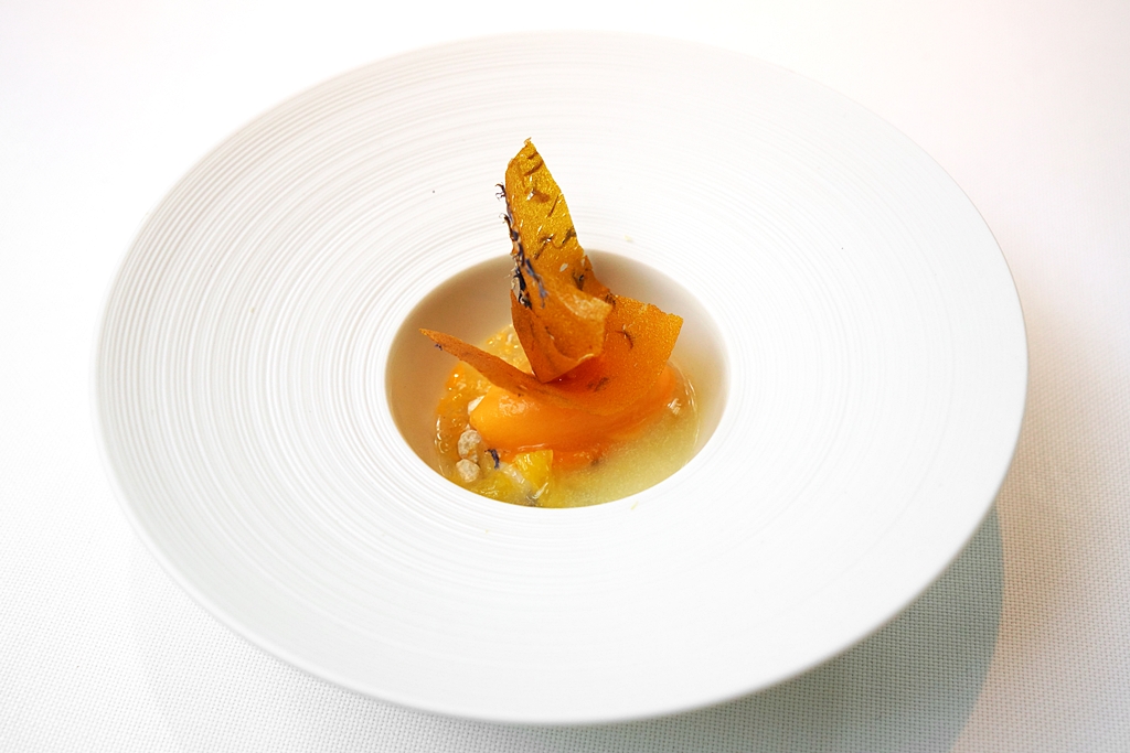 6th course : SEA BUCKTHORN & MANDARIN / salted almonds / whey [15/20] – ซอร์เบต์ซีบัคธอร์นเสิร์ฟคู่กับแยมส้ม อัลมอนด์ ช็อกโกแลตหินและเวย์โปรตีนเพื่อเติมความสดชื่น