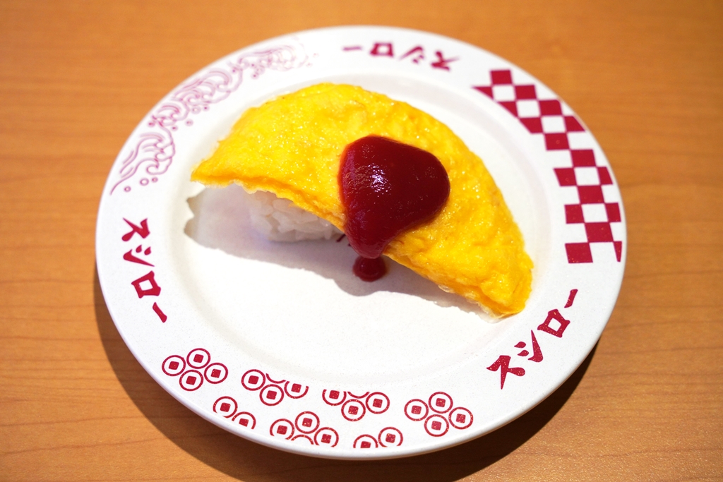 10. Omurice Sushi (150 JPY) [11/20] – ซูชิหน้าข้าวห่อไข่ราดซอสมะเขือเทศ จานนี้แปลกดีแต่ไม่ผ่านครับ
