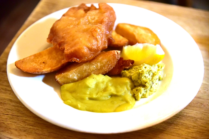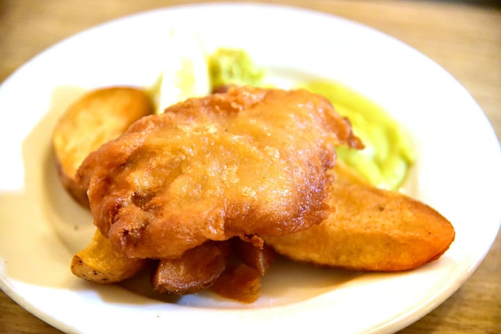5. Fish, Chips, Mushy Peas, Tartare Sauce (6.95 GBP) – ปลาชุบแป้งทอดเสิร์ฟคู่กับมันฝรั่งทอดชิ้นใหญ่และถั่วเขียวบด