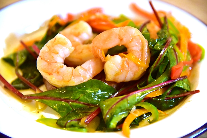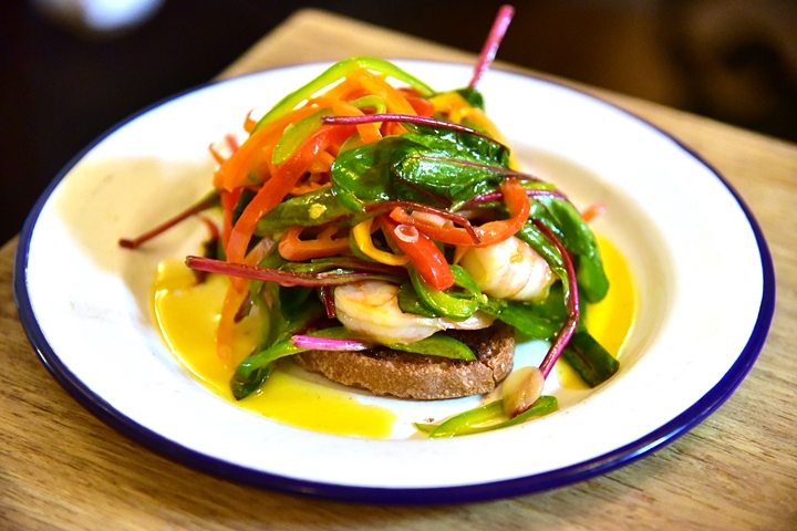 4. Pan Fried Prawns, Chilli + Garlic Butter, Toast (6.95 GBP) – กุ้งย่างเนื้อหวานกรอบเสิร์ฟคู่กับขนมปังปิ้งหน้าเนยกระเทียมและพริกหวาน