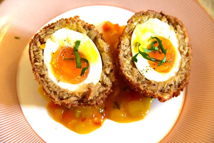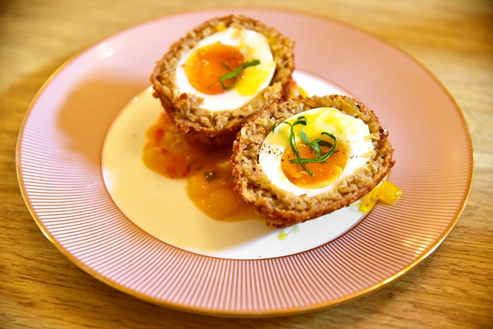 1. Vegetable Skirlie Scotch Egg, Piccalilli (4.75 GBP) – สก็อตเอ็กห่อเนื้อหมูชุบเกล็ดขนมปังทอดกรอบเสิร์ฟคู่กับซอสรสเปรี้ยวหวาน