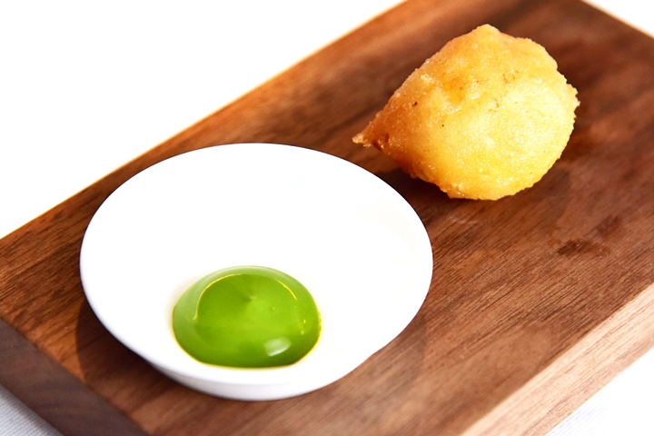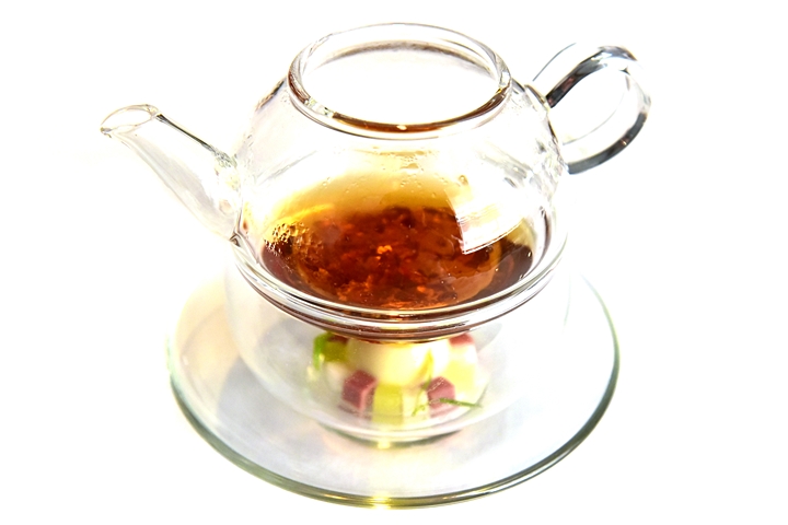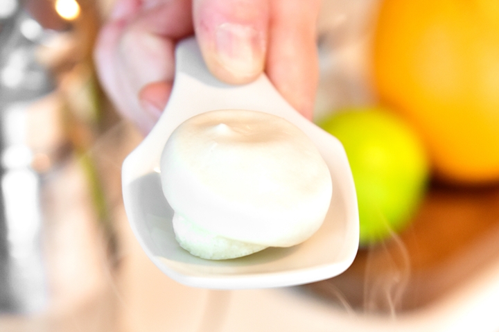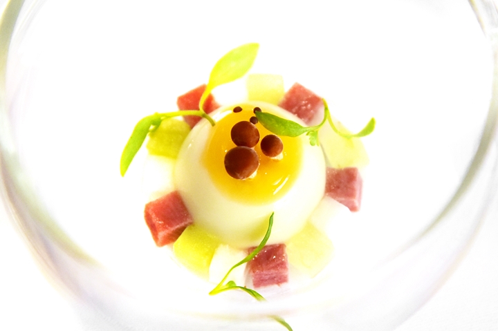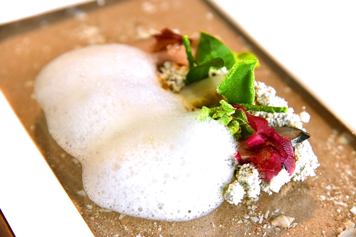 1st course: A CHANGE-OF-AIR – เมนูสำหรับกระตุ้นความตื้นเต้นของมื้ออาหารนี้ที่ประกอบไปด้วย “ค็อกเทลว้อดก้าแบบกรอบ” ที่ปรุงด้วยไนโตรเจนเหลวและ “มาการองบีทรูท” เนื้อเบาที่สอดไส้ด้วยครีมที่รสชาติซับซ้อนยอดเยี่ยมมากๆ