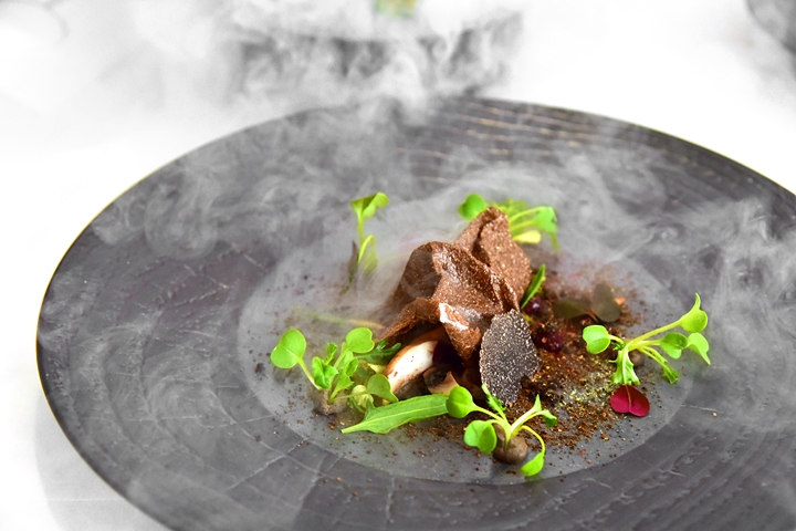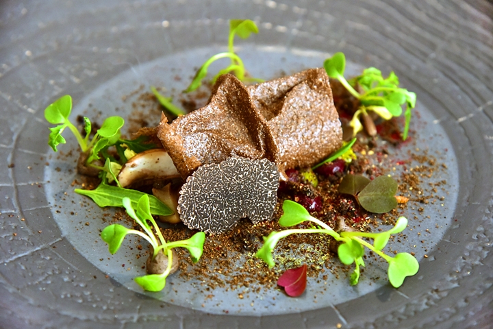 8th course: DAMPLING THROUGH the BOROUGHGROVES – เมนูที่นำเอาความเป็น “ป่า” และ “ดิน” มารวมตัวกันไว้ได้อย่างสมบูรณ์แบบอันประกอบไปด้วยเห็ดนานาชนิด รสด่วนทอดกรอบ แจมบีทรูทและแบล็กเบอร์รี ที่หอมกลิ่นเห็ดแบบเต็มเปี่ยมจริงๆ ตอนเสิร์ฟนี่พนักงานจะเอาป่าจำลองมาตั้งกลางโต๊ะและทำการปล่อยควันหอมๆแบบพวยพุ่งไปด้วย