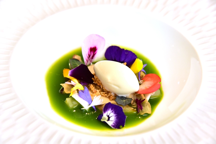 2nd course: JUST THE TONIC WE NEED – เมนูสลัดสมุนไพรสีเขียวสดใสโรยหน้าด้วยไอศกรีมอาร์ติโชกที่เลียนแบบเมนูโทนิคสมุนไพรที่ชาวอังกฤษชอบรับดื่ม