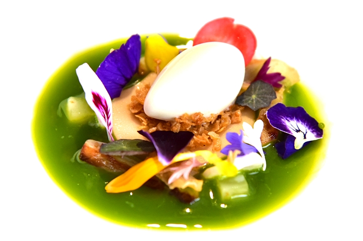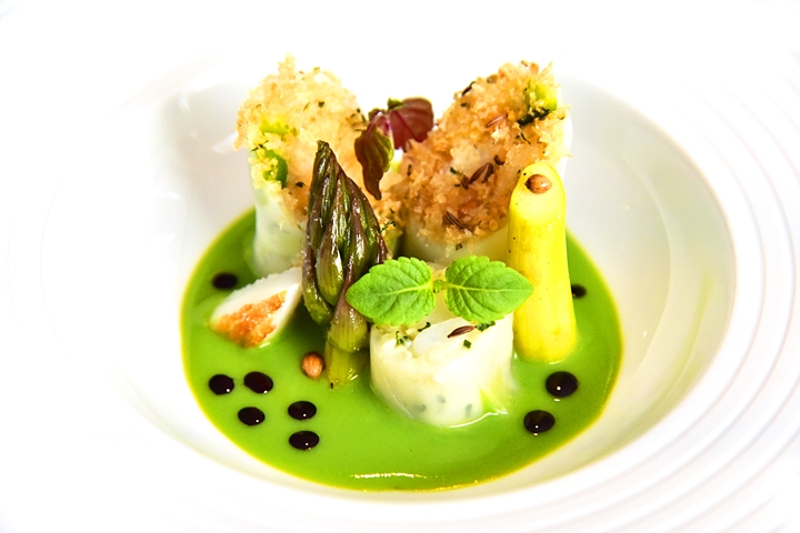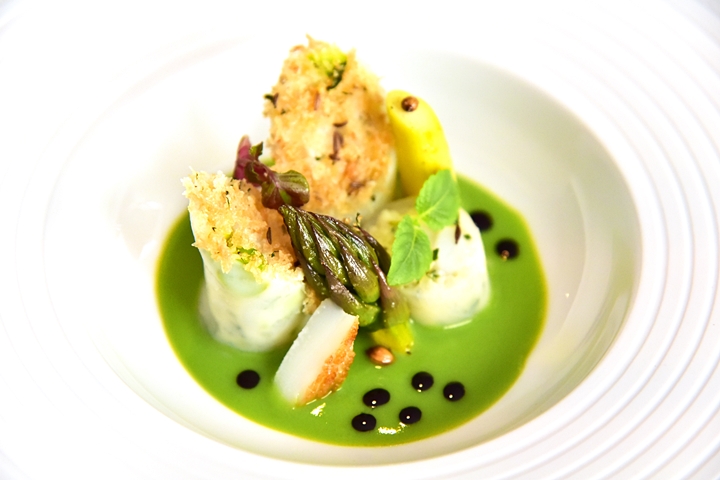 10th course: Starter – Cuttlefish Cannelloni – ปลาหมึกกระดองห่อเนื้อปลาค้อดในซอสเนยถั่วลันเตาสีเขียวสดเสิร์ฟคู่กับเนื้อหมึกกระดองย่างหอมๆและหน่อไม้ฝรั่ง