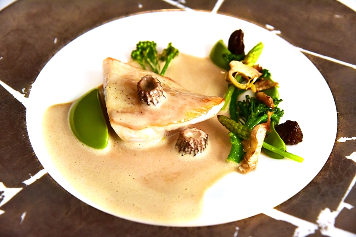 11th course: Main Course – Fish of the Day – เนื้อปลาจอห์นดอรี่ในซอสเห็ดมอเรลล์และซอสกระเทียมป่ารสเข้มข้นที่เข้ากันได้เป็นอย่างดี แถมด้วยเนื้อปลาค้อดผสมมันบดทอดกรอบที่อร่อยมากๆๆๆๆ