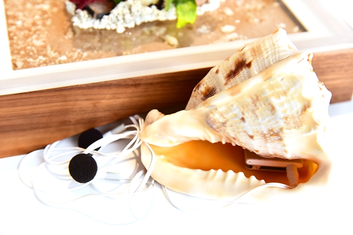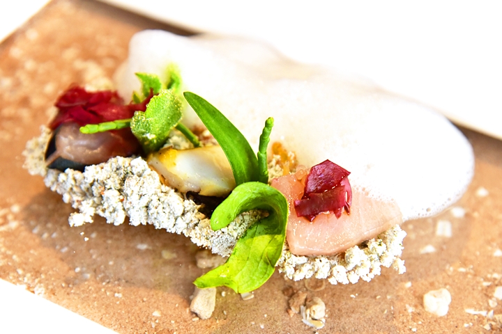 5th course: SOUND of the SEA – เนื้อปลาฮามาจิ แมคเคอเรลและหอยเป๋าฮื้อเสิร์ฟพร้อมกับมะนาวเม็ดกลม เม็ดทรายรสเค็มและโฟมทะเลที่ตอนทานจะต้อง “ฟังเสียงจากทะเล” ผ่านเปลือกหอยไปด้วยเพื่อสร้างบรรยากาศแบบทะเล๊ทะเล และรสชาติของจานนี้ก็ทะเลมากครับ หนักเค็มไปนิด แต่ก็อร่อยและแปลกดี ค็อนเส็ปต์เยี่ยมมาก