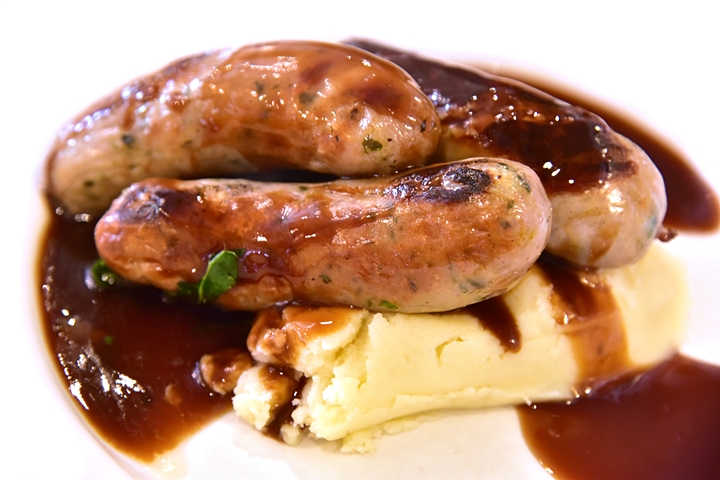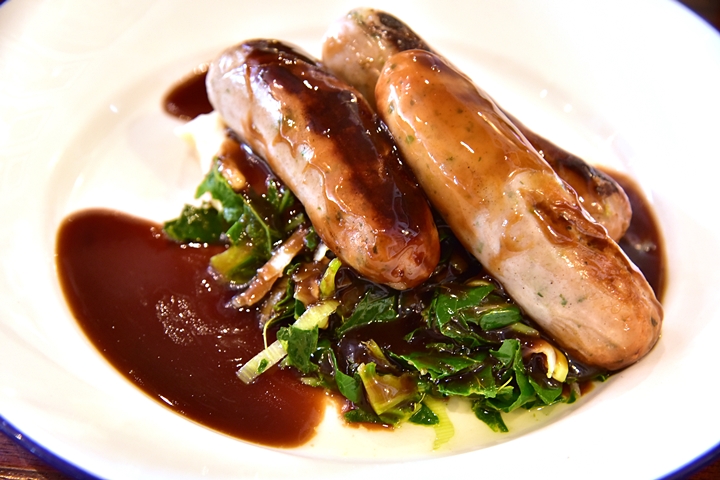 2. Pork and Leek Sausages (11.95+ GBP) – ไส้กรอกเนื้อหมูผสมสมุนไพรสไตล์อังกฤษเสิร์ฟคู่กับมันบดหอมๆและซอสเกรวี่รสหวานฉ่ำ