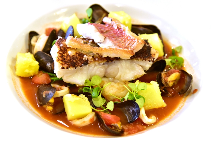 3. Sicilian Fish Stew (16.45+ GBP) – เนื้อปลา Red Mullet ย่างเสิร์ฟในสตูว์ซีฟู้ดหลากหลายชนิด