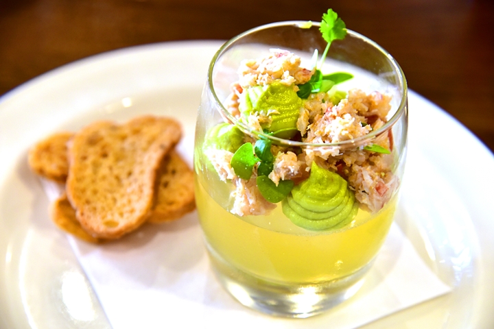 1. Tomato Jelly (6.45+ GBP) – เจลลี่มะเขือเทศสีเขียวรสหวานฉ่ำเสิร์ฟคู่กับเนื้อปูและครีมอโวคาโด