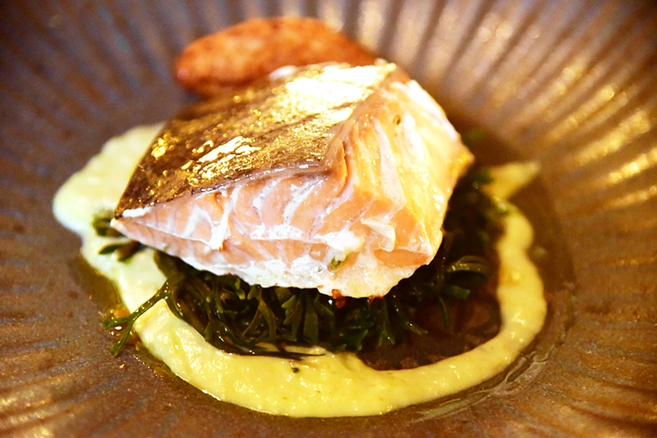 2nd course: Confit of Salmon, seashore vegetables, fennel cream, brown crab beignet – เนื้อปลาแซลม่อนย่างได้สุกกำลังดีเสิร์ฟคู่กับขนมเนื้อปูทอด ครีมซอสและสาหร่ายทะเลหน้าตาประหลาดๆ