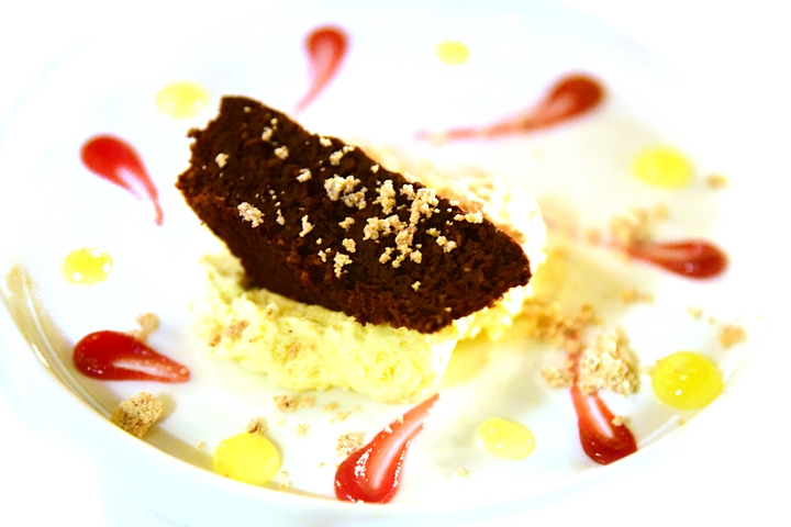 3rd course: Dark Chocolate & Beetroot Sponge, white chocolate and orange mousse – เค้กดาร์กช็อกโกแลตทานคู่กับมูสส้ม