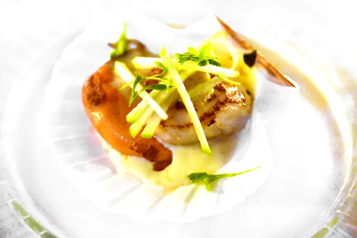 1st course: Grilled Isle of Mull Scallop, cauliflower puree, curry sauce, apple & coriander – หอยเชลล์ย่างตัวใหญ่จากเกาะ Mull เสิร์ฟคู่กับพิวรีดอกกะหล่ำและแอปเปิ้ล