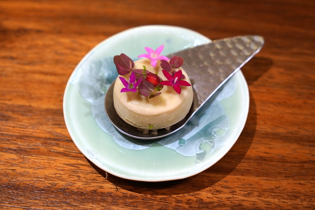 10th course : Hibiscus Spiced Gujiya [17/20] – เมนูล้างปากก่อนเข้าเมนคอร์สที่เป็นไวท์ช็อกโกแลตสอดไส้น้ำดอกชบาและป็อปปิ้งแคนดี้ที่แตกโพละสดชื่นเต็มปาก