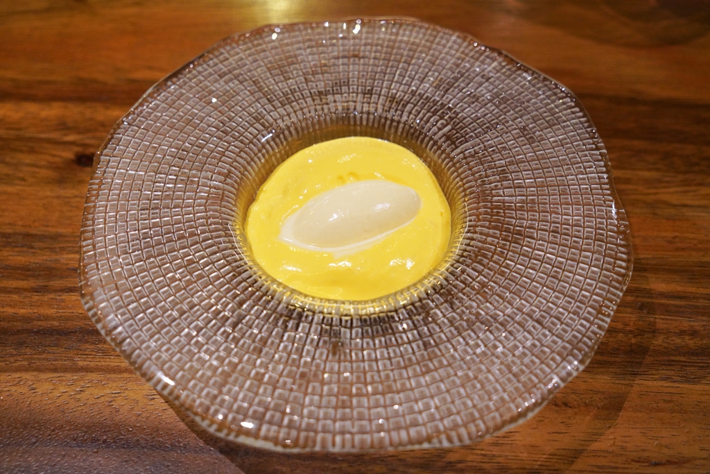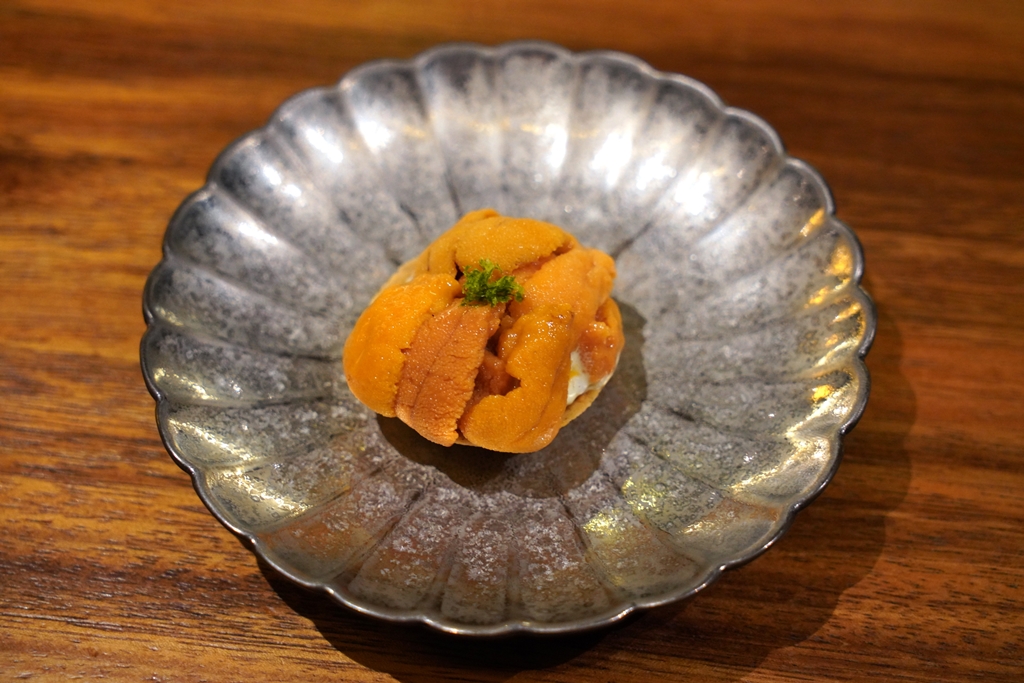 7th course : Uni Corn ~ Papad [17/20] – ทาร์ตไส้ข้าวโพดญี่ปุ่นกับซอสครีมเสิร์ฟคู่กับไข่หอยเม่นสายพันธุ์บาฟุนแบบจุใจ