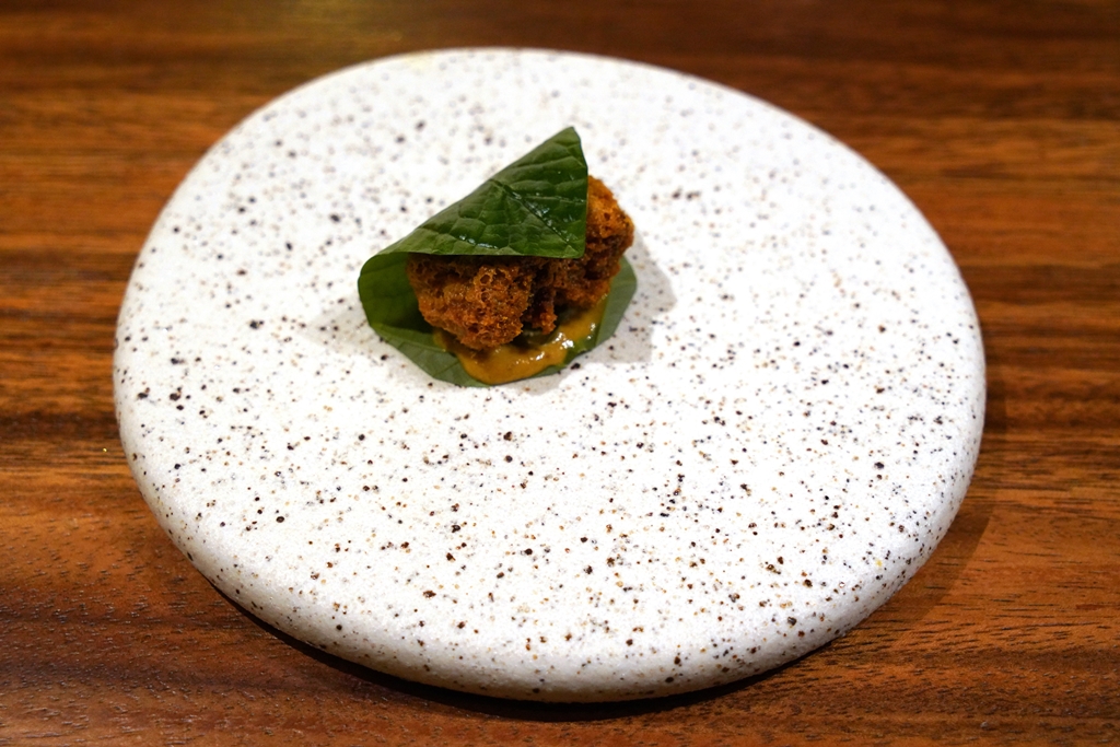3rd course : Crispy Pork ~ Sambal Aioli ~ Betal Leaf [17/20] – หมูเนื้อฉ่ำทอดกรอบกับแป้งกรุบๆห่อด้วยใบพลูหอมๆปรุงรสด้วยน้ำพริกแซมบัล