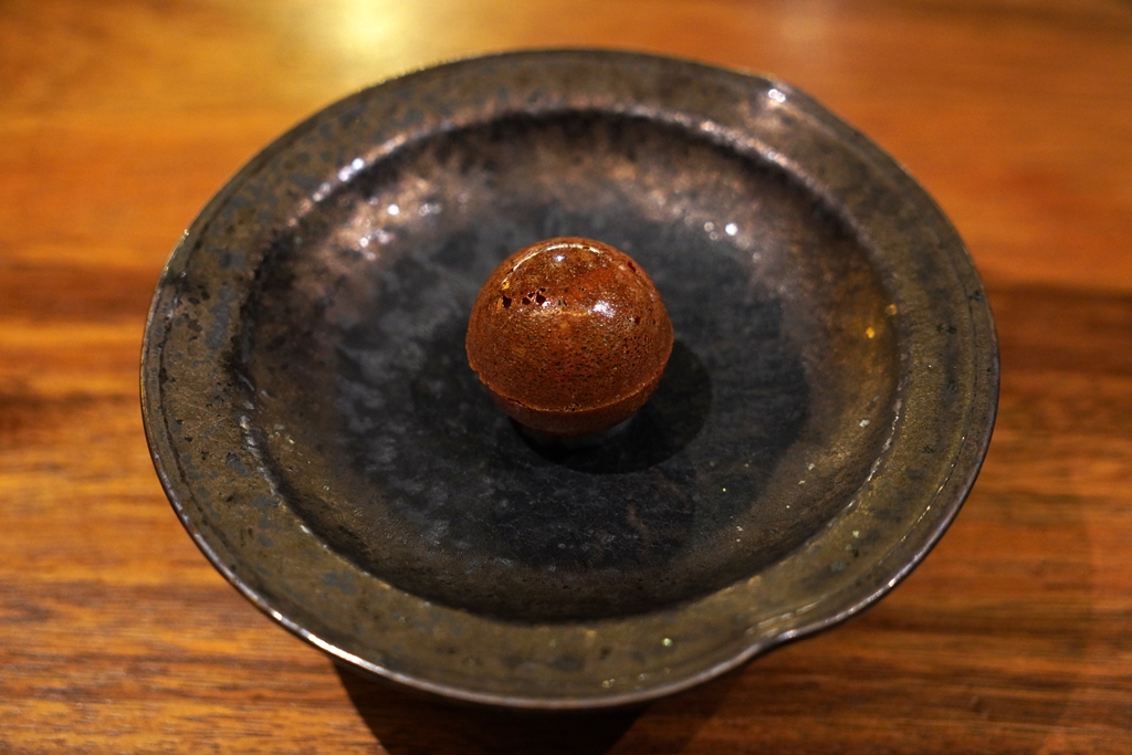 4th course : Tomato Pani Puri [18/20] – พานิพูริแบบ Thevar ที่นำน้ำมะเขือเทศมาทำให้แห้งและขึ้นรูปเป็นก้อนกลมสอดไส้โยเกิร์ตที่ระเบิดเต็มปาก