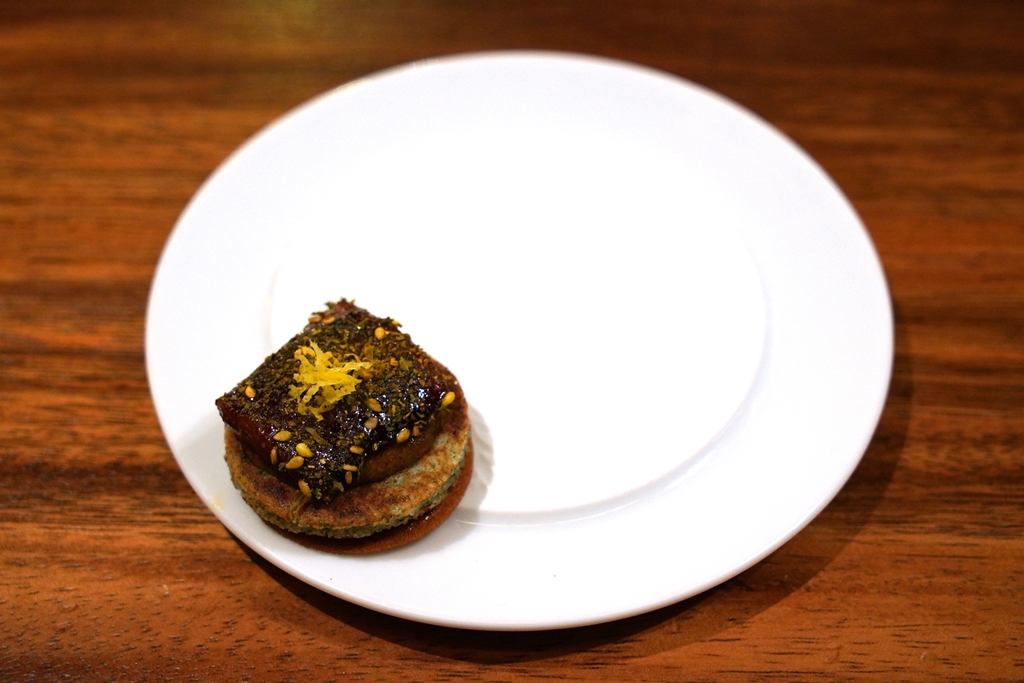 5th course : Smoked Eel Nori Uttapam [17/20] – แพนเค้กแบบอินเดียผสมสาหร่ายเสิร์ฟคู่กับปลาไหลย่างเคลือบซอสมะขาม