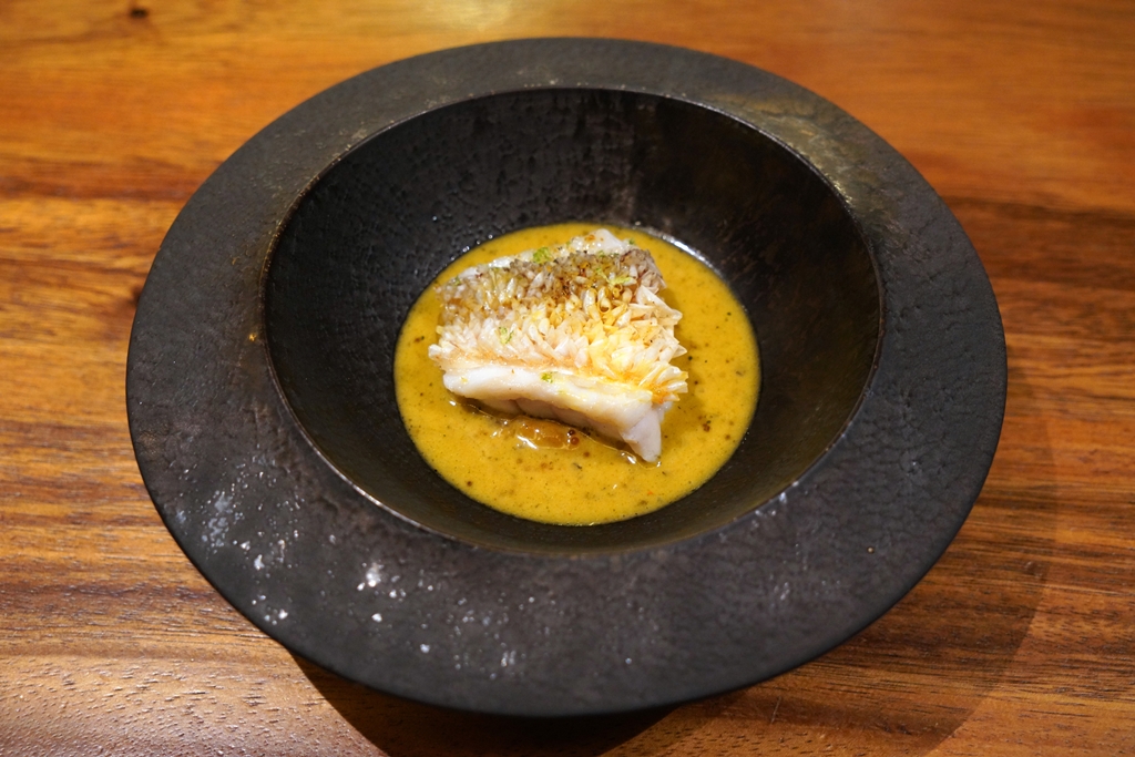 6th course : Amadai ~ Malabar Beurre Blanc [16/20] – ปลาอามะไดเสิร์ฟแบบเนื้อนุ่มเกร็ดกรอบในซอสเบอร์บลองค์เครื่องเทศมาลาบาร์คู่กับไข่ปลา