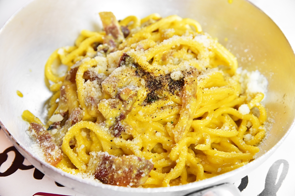3. Tonnarello Carbonara (9.0 EURO) – พาสต้าเส้นกลมหน้าเหนียวแน่นกรุบในซอสคาร์โบนาร่ากับเบค่อน ตัวซอสรสชาติค่อนข้างนุ่มนวล ตัวเส้นทำออกมายอดเยี่ยมมากๆ