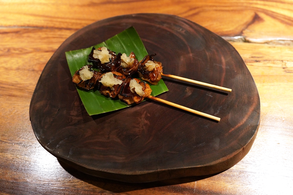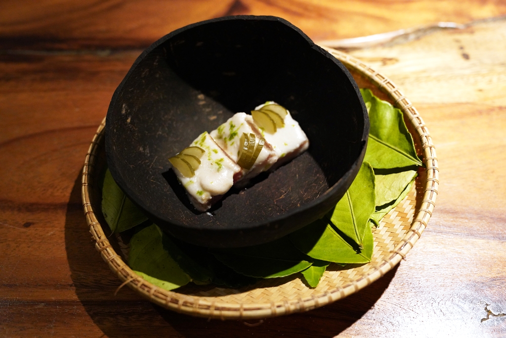 4th course : Mga Kilaw [18/20] – เมนู “ปลาดิบหมักน้ำส้มสายชู“ สไตล์ฟิลิปปินส์ที่เสิร์ฟมา 2 รูปแบบ ได้แก่ ปลาแมคเคอเรลและปลาทูน่าราดซอสมะพร้าว เคียงด้วยข้าวเกรียบหน้าเนื้อแพะหมักและหมูสามส่วนเสียบไม้ย่าง คอร์สนี้อลังการและอร่อยทุกอย่างเลยครับ