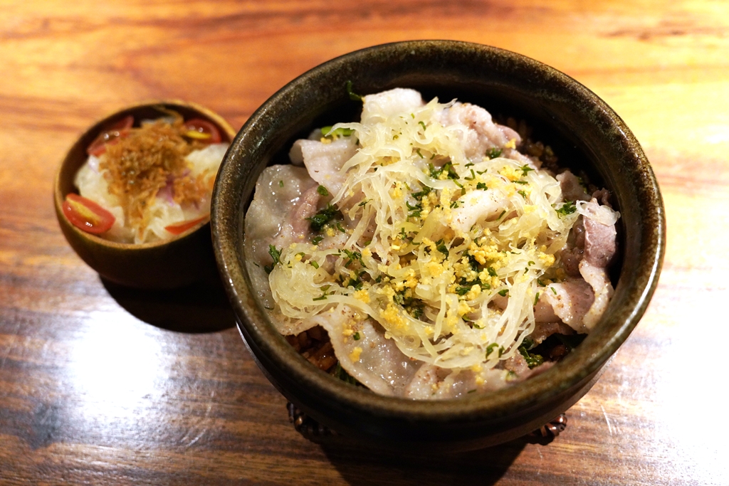 9th course (Main #1) : Silog sa Palayok [17/20] – เมนคอร์สเซ็ตใหญ่ที่เสิร์ฟ “ข้าวอบหม้อดิน” เนื้อหมูสไลด์และไข่ปลาตากแห้งคู่กับเครื่องอีก 2 จานด้านล่าง ตัวข้าวรสชาติดีหอมและเนื้อเกรียมๆอร่อยเลยครับ