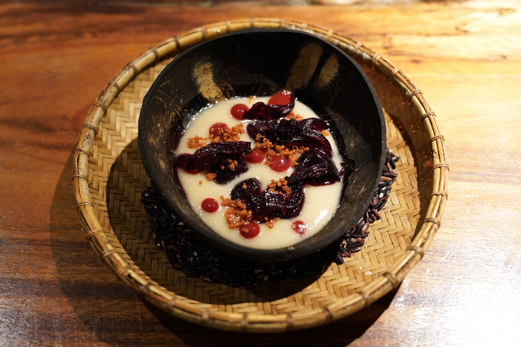 11th course : Purple Rice at Rosella [16/20] – เมนูขนมแป้ง “ข้าวเหนียวสีม่วง” เนื้อหนึบๆเสิร์ฟในน้ำกะทิรสหวานละมุนคู่กับ “กระเจี๊ยบแดง” ที่รสชาติอร่อยแบบที่คนไทยพอคุ้นๆครับ
