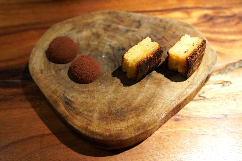 13th course : Cassava, Tsokolate [14/20] – ขนมหวานคำเล็กปิดท้ายมื้ออาหาร ได้แก่ ”ขนมเค้กมันสำปะหลัง“ สไตล์ฟิลิปปินส์ที่เนื้อด้านนอกจะเกรียมๆกรอบๆด้านในหนึบๆและ ”ช็อกโกแลตไส้น้ำปลา“ รสเข้มข้นที่เข้ากันแบบไม่คาว