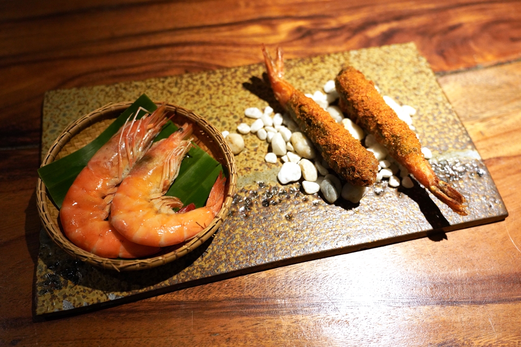 3rd course : Sawsawan [16/20] – เมนู “กุ้งสองอย่าง” ได้แก่ กุ้งห่อใบมันหวานชุบเครื่องเทศชุบแป้งทอดกรอบและกุ้งลวกเนื้อหวานเด้งแบบเย็นๆ เสิร์ฟคู่กับน้ำจิ้ม “มะพร้าวน้ำส้มสายชู” รสเปรี้ยวเบาหอมๆเข้ากัน