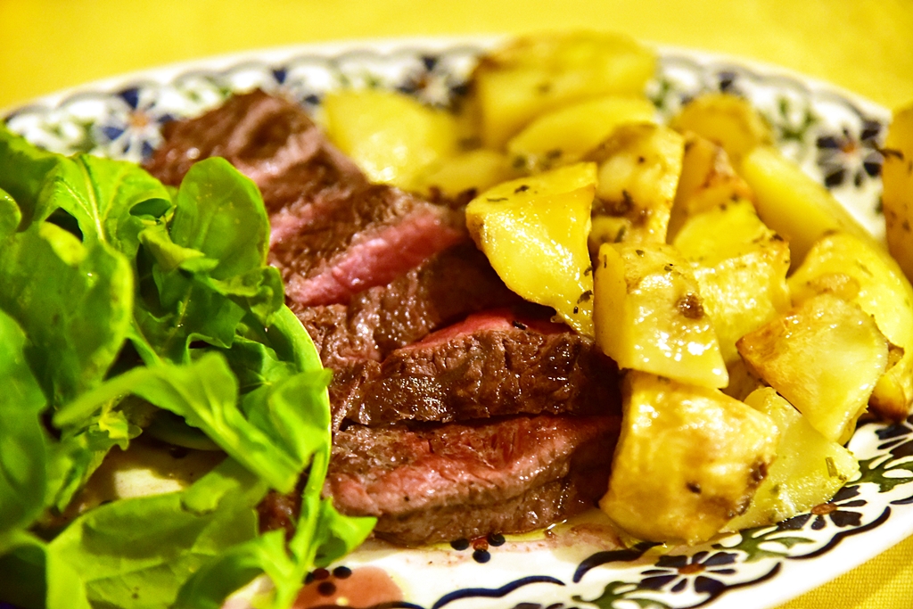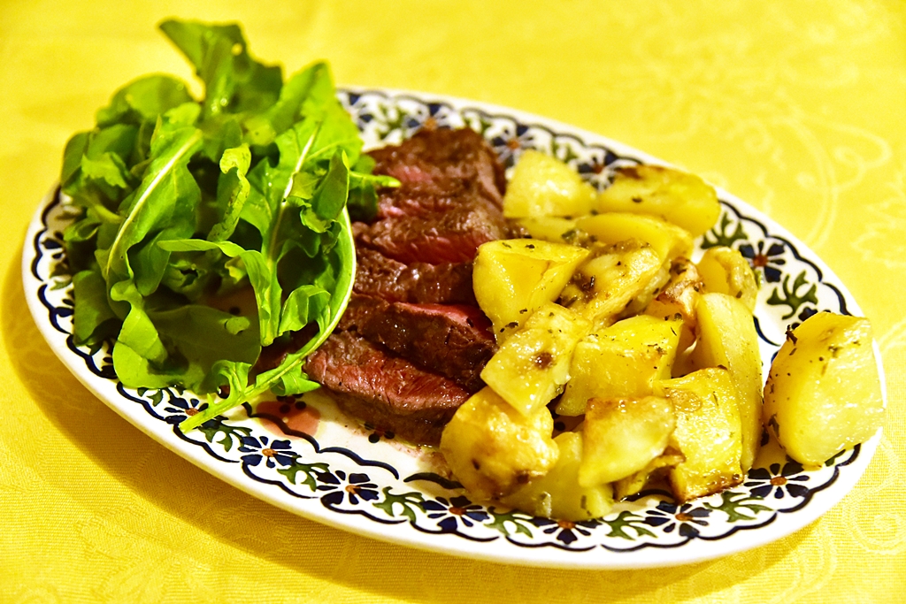 3. Grilled Beef with Rockets and Potatoes (15.50 EURO) – สเต็กเนื้อย่างรสเข้มเสิร์ฟกับมันฝรั่งอบและสลัดผักร็อกเก็ต