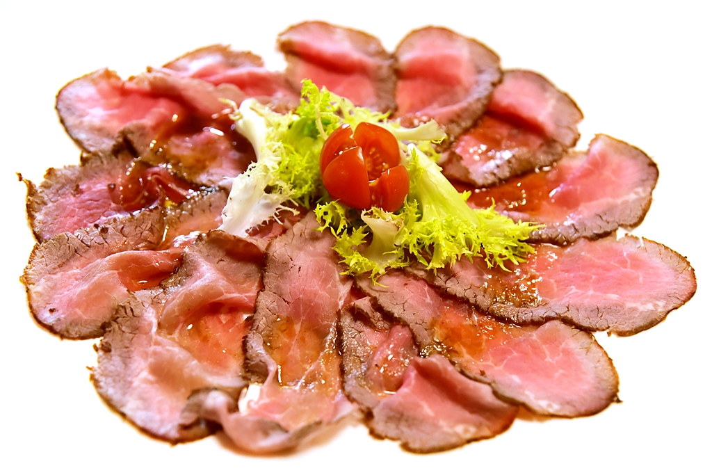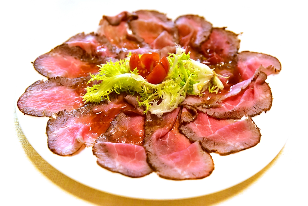4. Roast Beef (15 EURO) – เนื้ออบสไลด์บางเสิร์ฟแบบเย็นคู่กับน้ำซอสและผักสด
