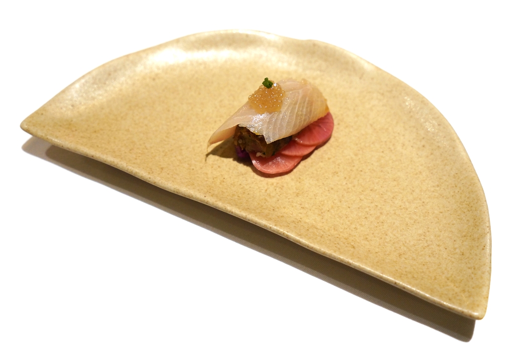 4th course : Esan Sausage | Surat Thani Dry-aged Kingfish | Pickled Red Cabbage | Pickled Radish [15/20] – ซูชิไส้กรอกอีสานที่เสิร์ฟซาชิมิปลาช่อนทะเลคู่กับขิงคาเวียร์บนไส้กรอกอีสานที่มีข้าวผสมอยู่ทานเคียงกับแรดิชดอง